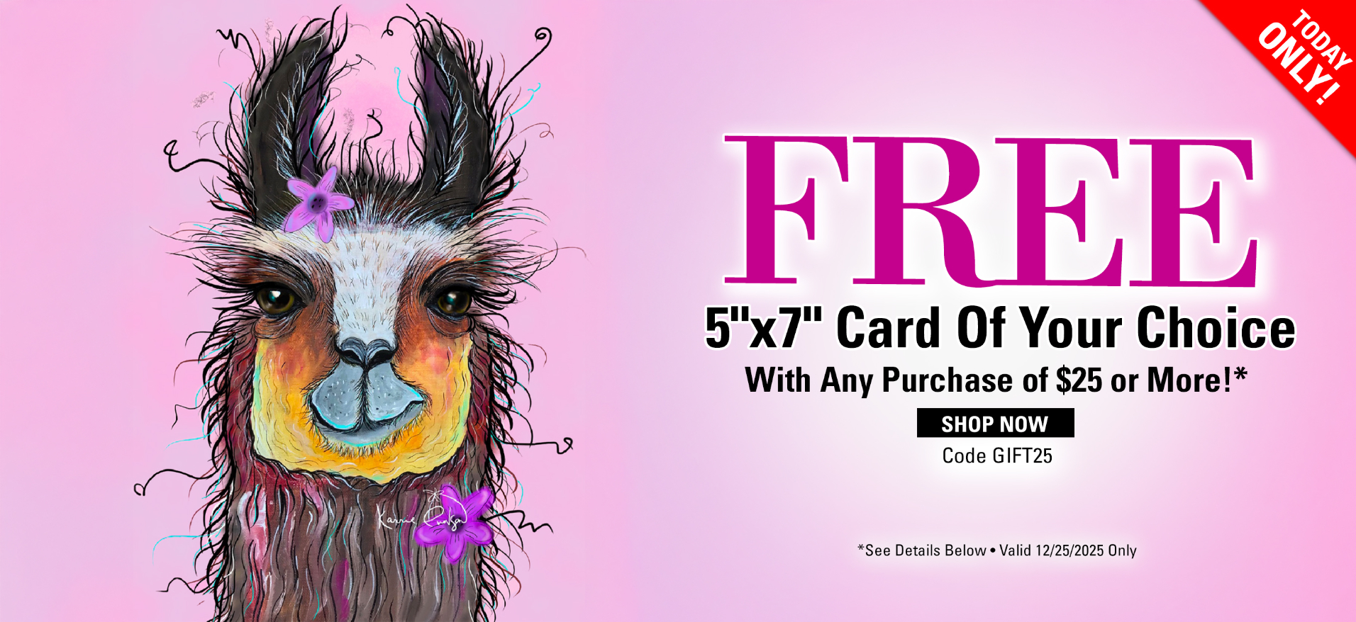 | Minimum purchase: | $25 of any items (not including tax or shipping). Free card does not count toward minimum purchase required. Free 5"x7" card of your choice must be added to cart prior to checkout. Lowest-priced item in cart will be deducted; discount will appear after all buyer's information and coupon code are entered and applied at checkout. |